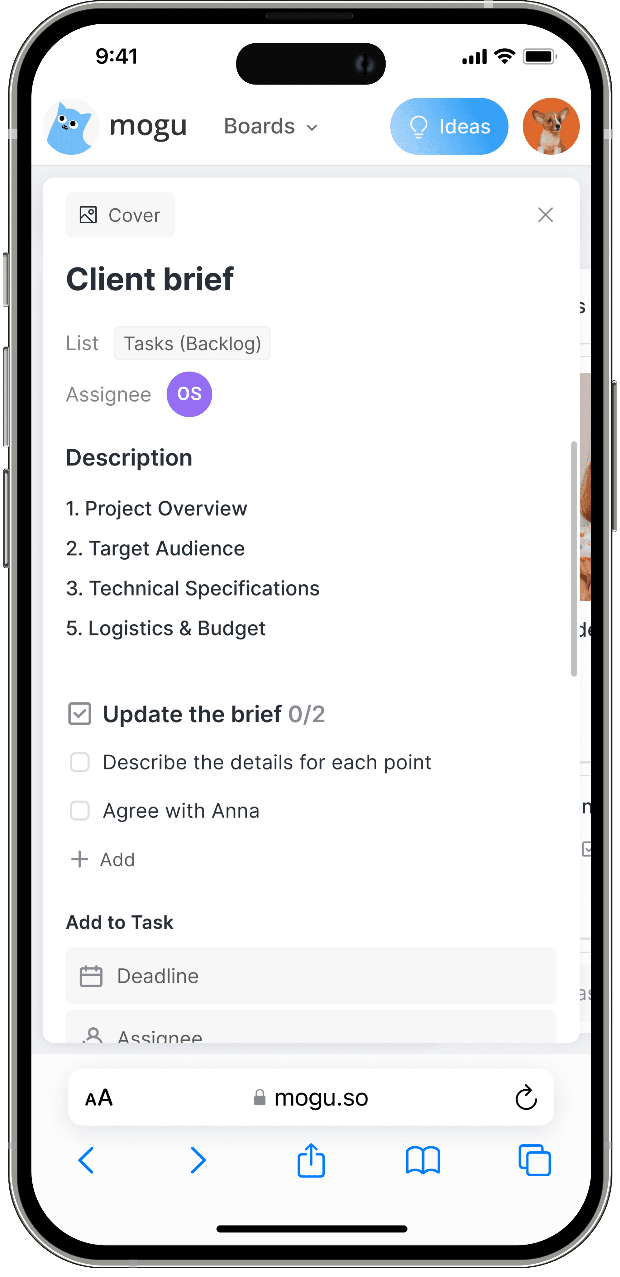 A contextual AI widget acts as a strategic partner, generating tailored tasks and creative ideas both at project kickoff and throughout its lifecycle. By providing instant content angles and workflow steps, it eliminates creative blocks and keeps marketing teams in a constant state of flow.